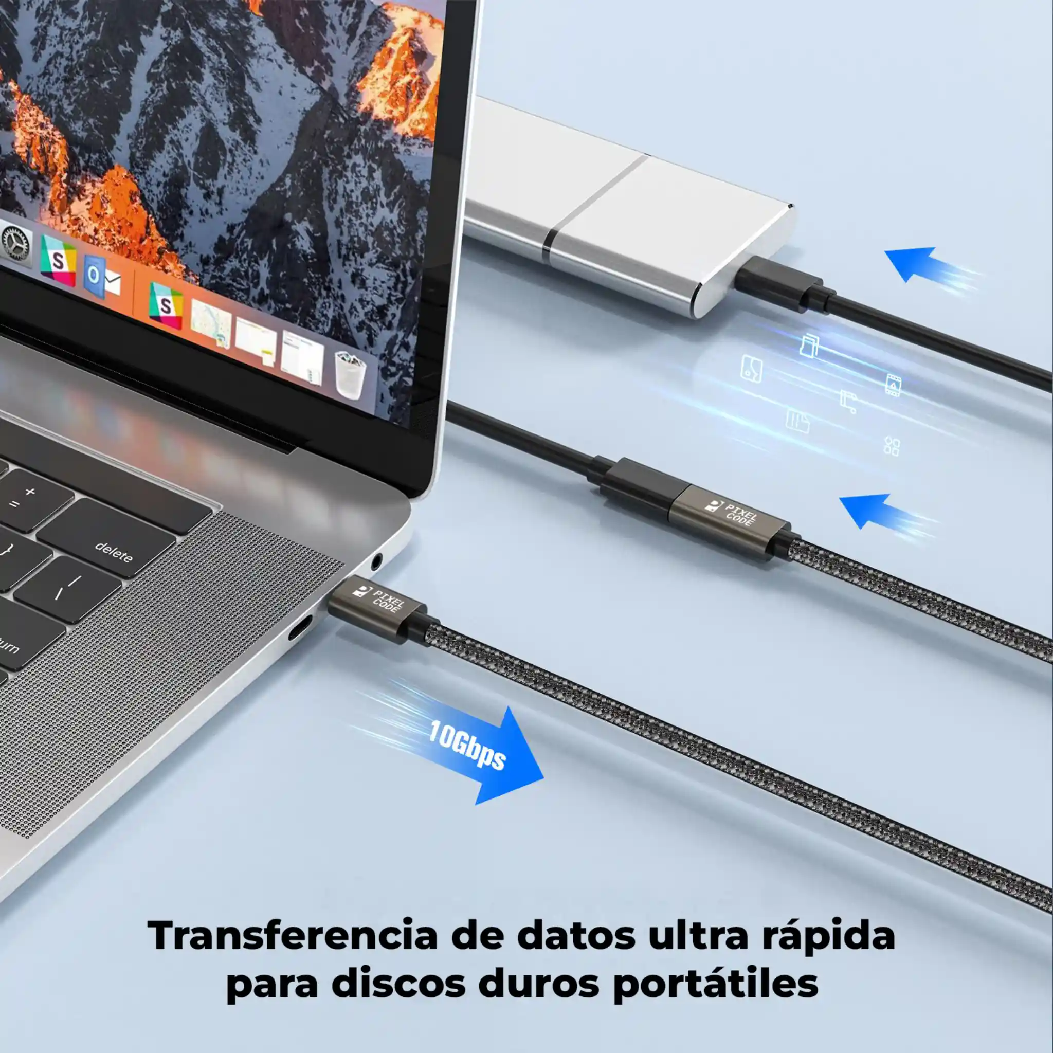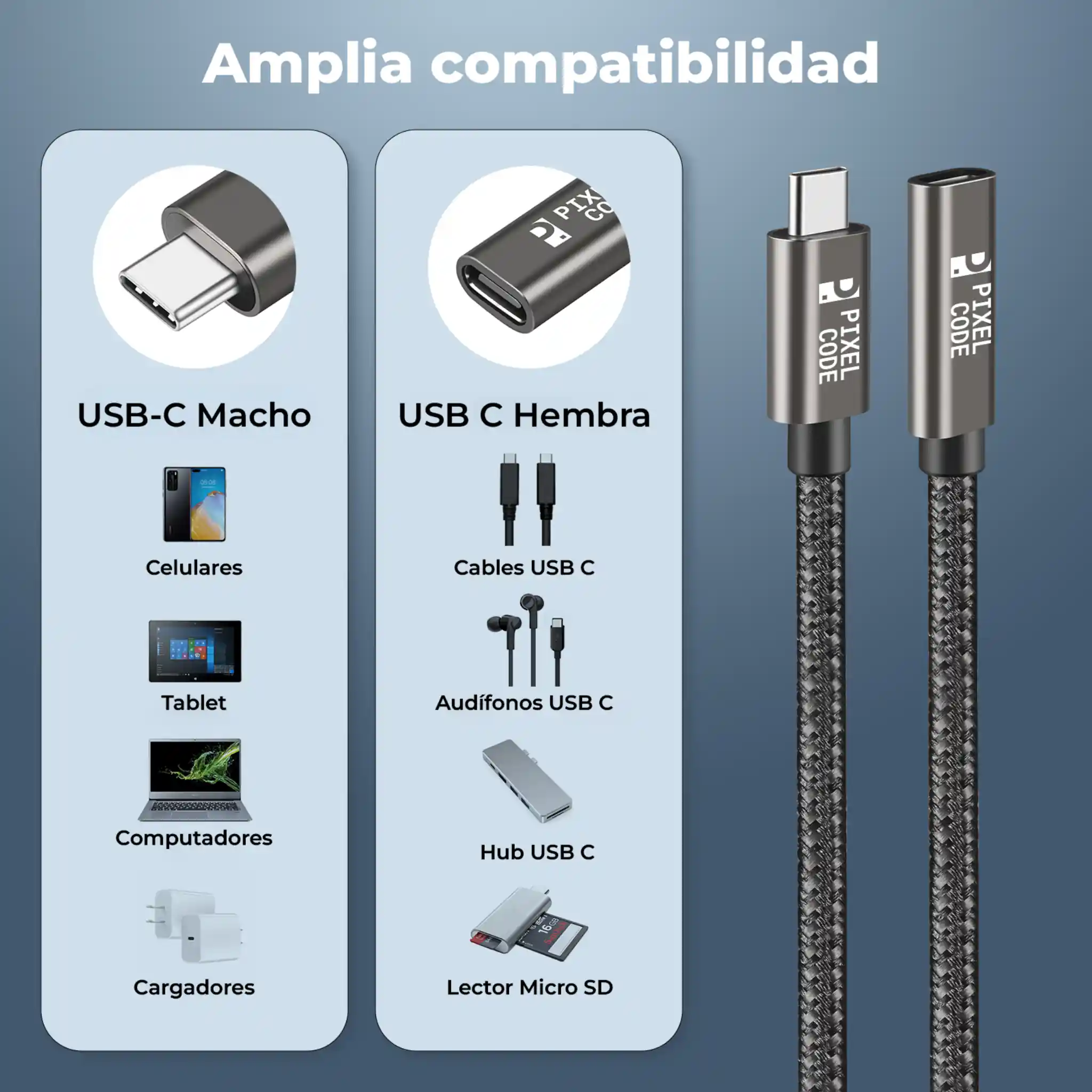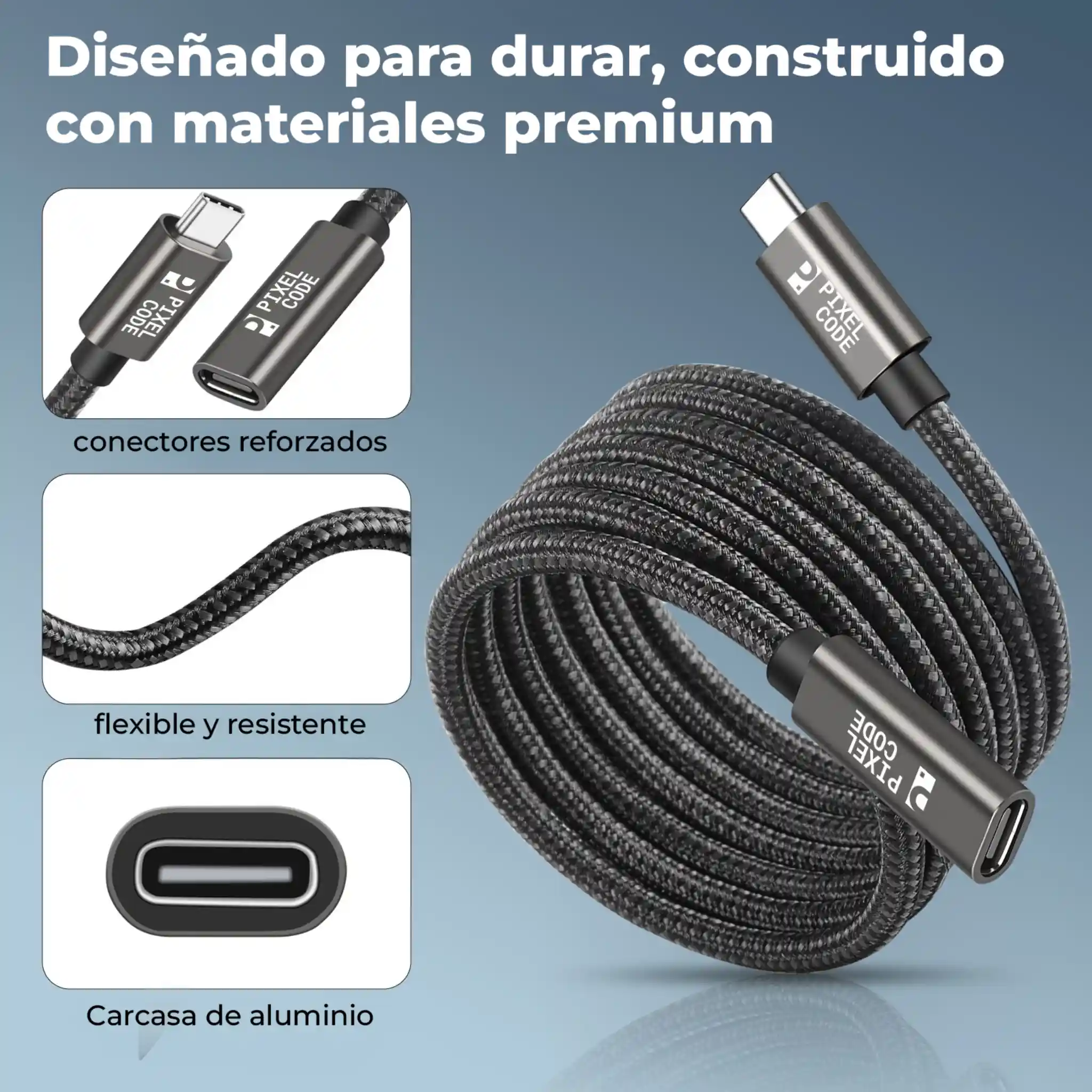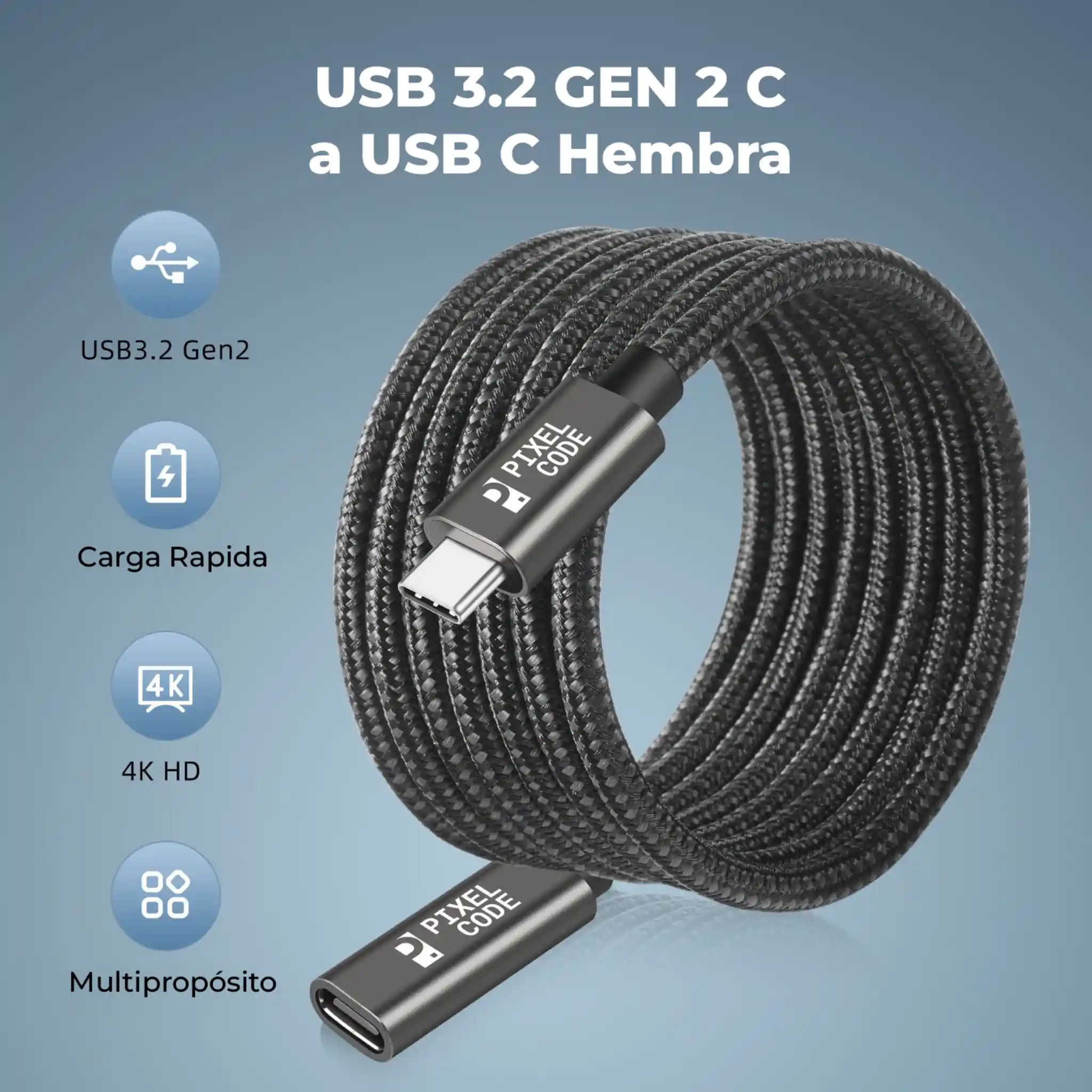 Cable extensión USB-C Pixel Code de 2m con datos 10Gbps, carga rápida 60W y video 4K@60Hz. Protege puertos y mejora tu espacio con construcción trenzada premium y compatibilidad con USB-C y Thunderbolt 3/4.