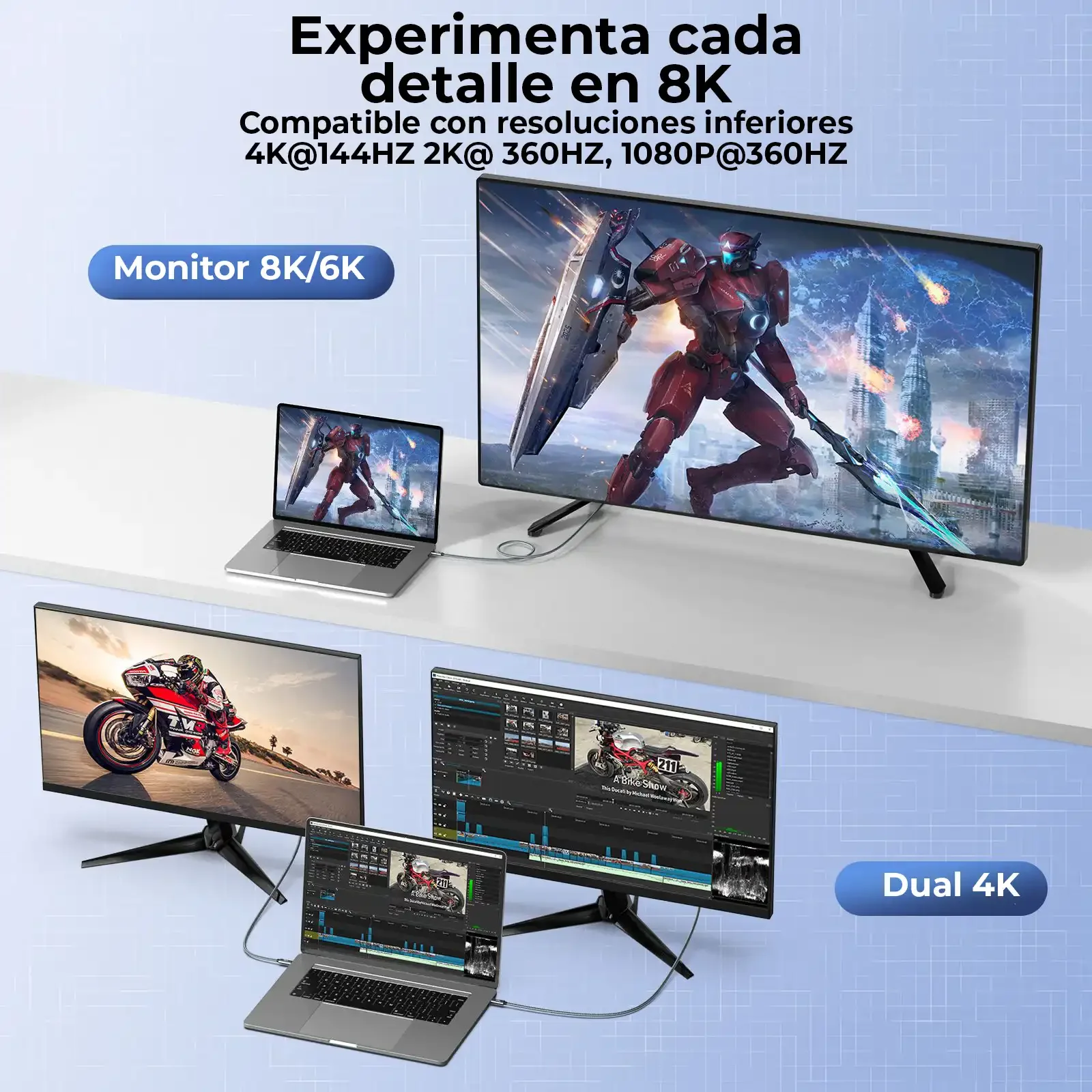 Video 8K HDR y 4K 144Hz: Con salida de video mediante DisplayPort Alt Mode, soporta 8K HDR y tasas altas como 4K@144Hz (además de resoluciones inferiores como 2K@240Hz y 1080p@240Hz). Ideal para monitores, proyectores y docks que buscan imagen fluida, definida y con gran rango dinámico.