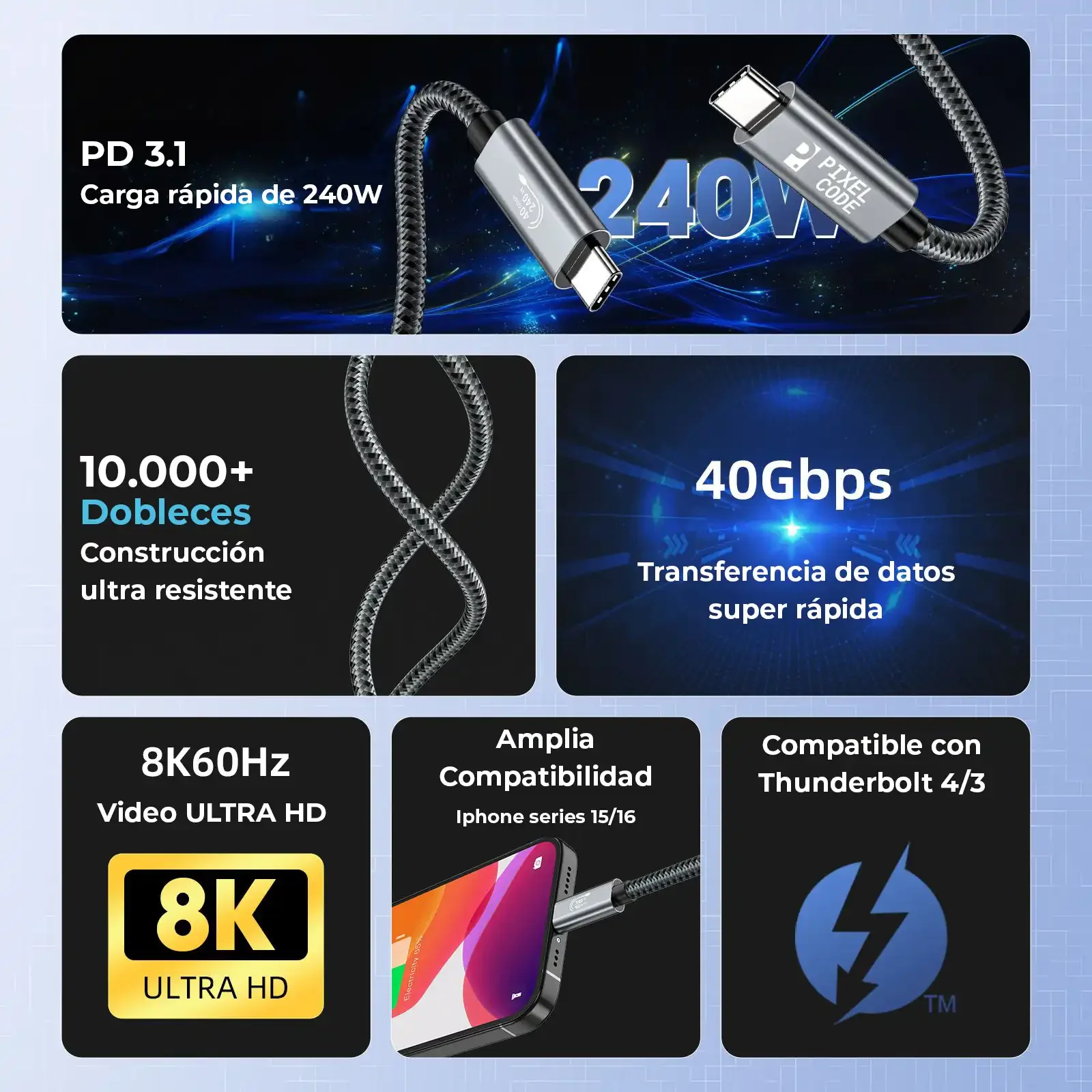 Cable USB4 Pixel Code de 1.5m con carga PD 3.1 hasta 240W, datos hasta 40Gbps y salida de video 8K HDR/4K 144Hz. Nylon trenzado y triple blindaje para uso exigente.