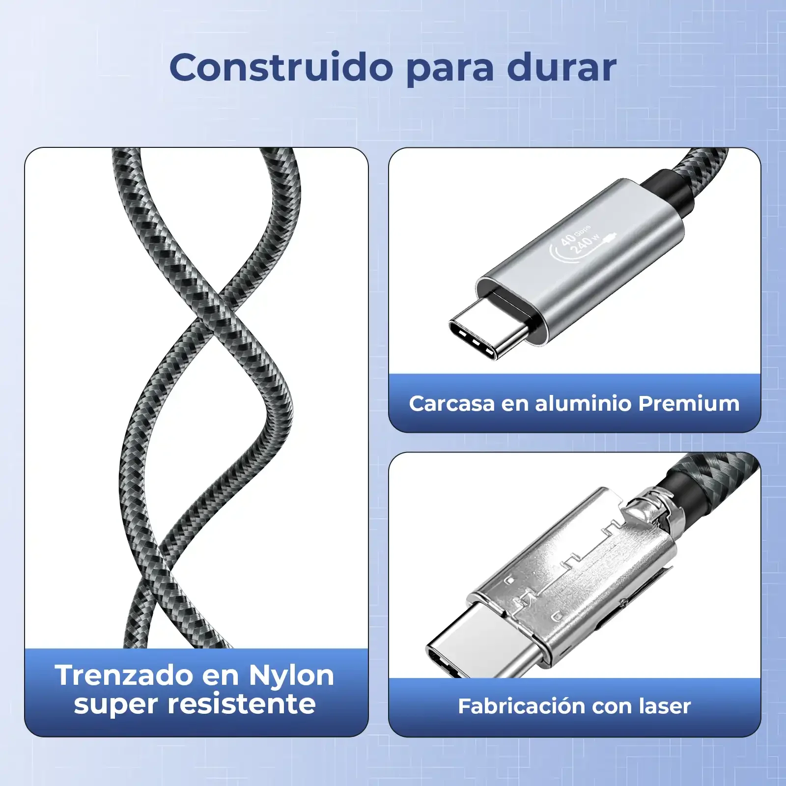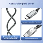 Potencia real 240W PD 3.1: Con soporte de carga rápida Power Delivery 3.1 hasta 240W (48V/5A), es ideal para laptops y equipos que requieren energía estable. También es compatible con cargas inferiores como 100W, 140W y 180W, para que uses el mismo cable en distintos cargadores sin complicarte.